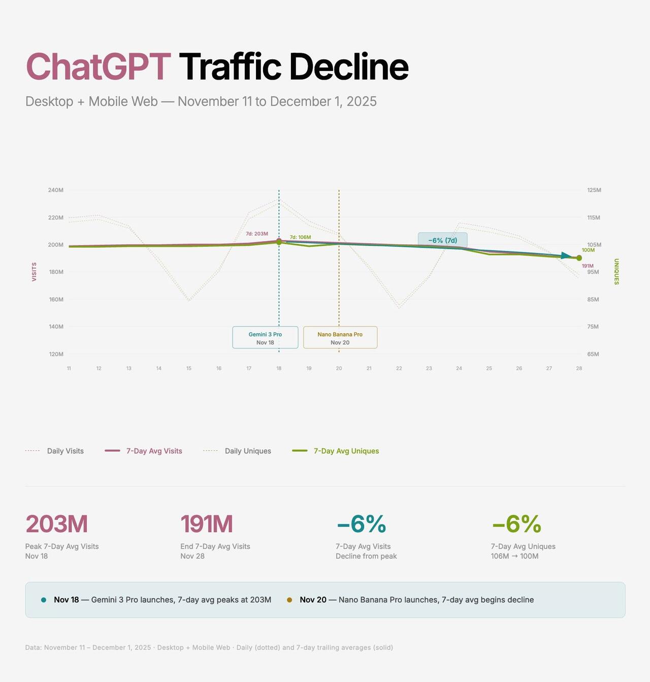 据Deedy Das统计,自GoogleGemini 3发布以来的两周内,ChatGPT的每日独立活跃用户数(七天均值)已下降6%,显示出竞争压力的直接影响。虽然OpenAI仍拥有超过8亿周活跃用户,在整体聊天机器人使用中占据主导地位,但用户正在向Google流失。