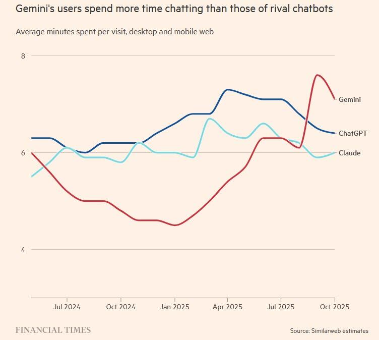 更值得注意的是,用户现在在Gemini上的聊天时间已超过ChatGPT或Claude等聊天机器人竞争对手。