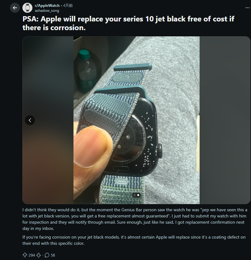 日前,有网友在Reddit论坛反馈称,自己的亮黑色Apple Watch S10在正常使用下,底壳黑色涂层竟然被腐蚀掉了,还出现了一片片麻点状银色斑点,该网友随后获得了苹果官方的免费更换服务。
