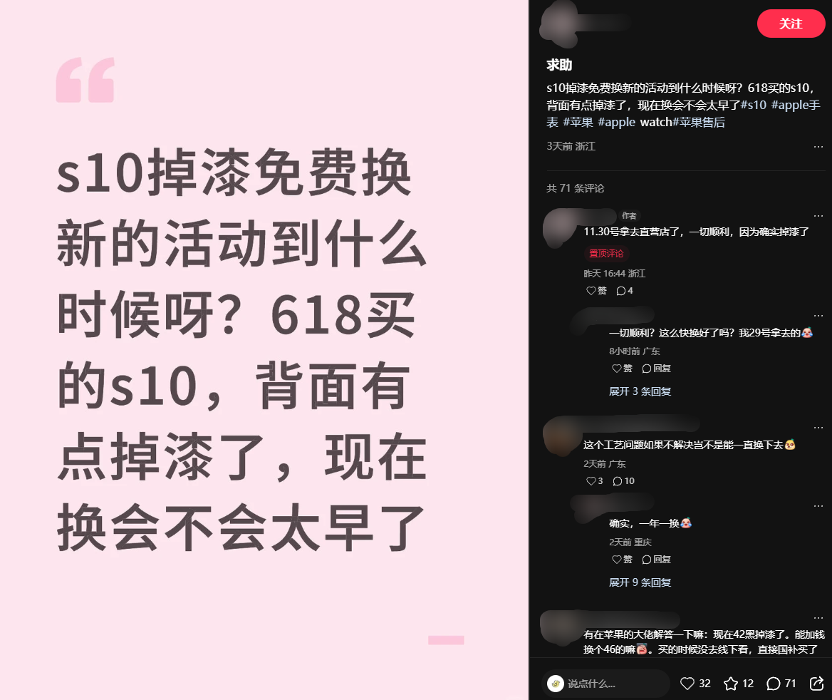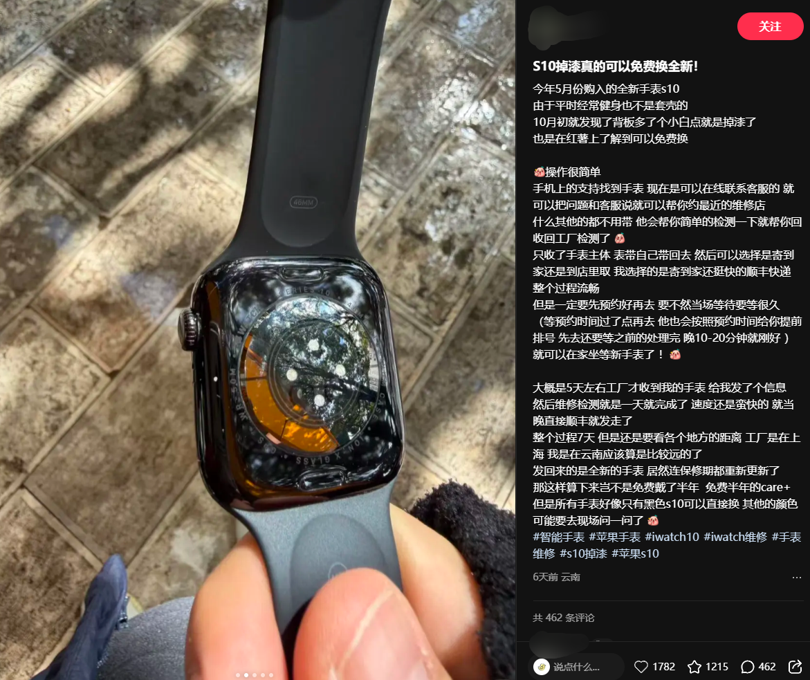 值得注意的是,在小红书上,也有不少用户晒出亮黑色Apple Watch S10掉漆的照片,部分已经过保的用户在联系苹果后同样成功更换新机。