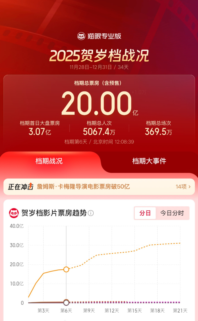 据猫眼专业版数据,截至今天12时08分,2025年贺岁档档期(11月28日-12月31日)总票房破20亿,《疯狂动物城2》领跑贺岁档票房榜。据了解,《疯狂动物城2》自11月26日起在全球57个国家和地区陆续上映。