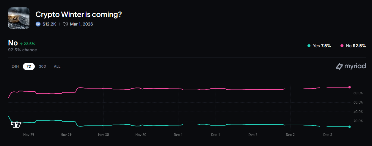 在2025年步入最后一个月之际,加密货币市场经历了一场震荡行情。在遭遇了12月头一天的暴跌后,市场在12月2日和3日出现企稳回暖,对此,众多市场交易员对加密货币的价格预测开始转向乐观。根据链上预测平台Myriad一项关于“加密货币市场是否会出现寒冬”的调查显示,仅有7.5%的用户持有悲观态度,这一比例较上周五(11月28日)的30%有所下降。
