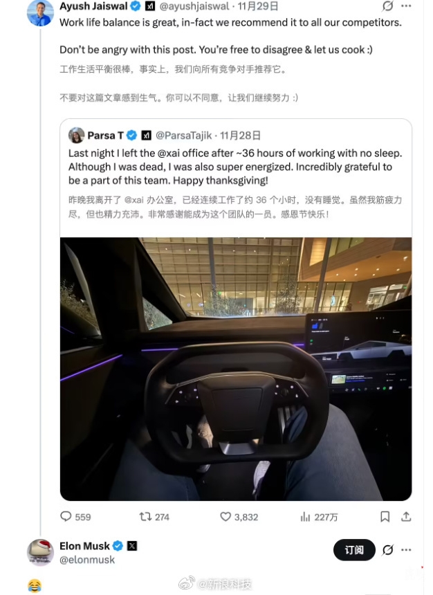 xAI员工称连续工作36小时不睡觉 马斯克回应“笑哭”表情