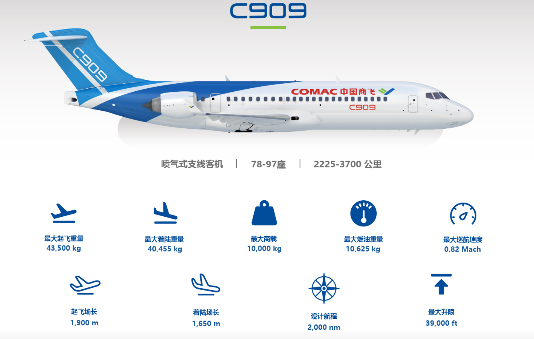C909座级78-97座,航程2225—3700公里,最大起飞重量43500千克,具有适应性、舒适性、经济性、共通性、系列化等特性。