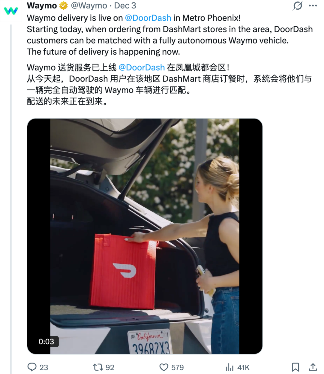 业务上,Waymo进入了新的赛道:送外卖。先梭哈AI再重注外卖(wAI mAI)定律,在大洋彼岸也生效了。
