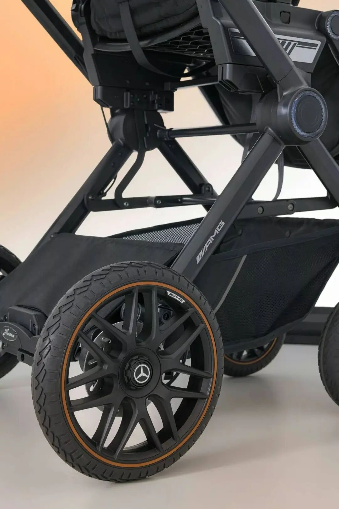 Mercedes-AMG GT2为大顶配,复刻了AMG标志性的交叉辐条轮毂、酒棕色缝线与专属徽标,将赛道基因融入了育儿场景,可轻松折叠后放入奔驰C级或A级车的后备箱。