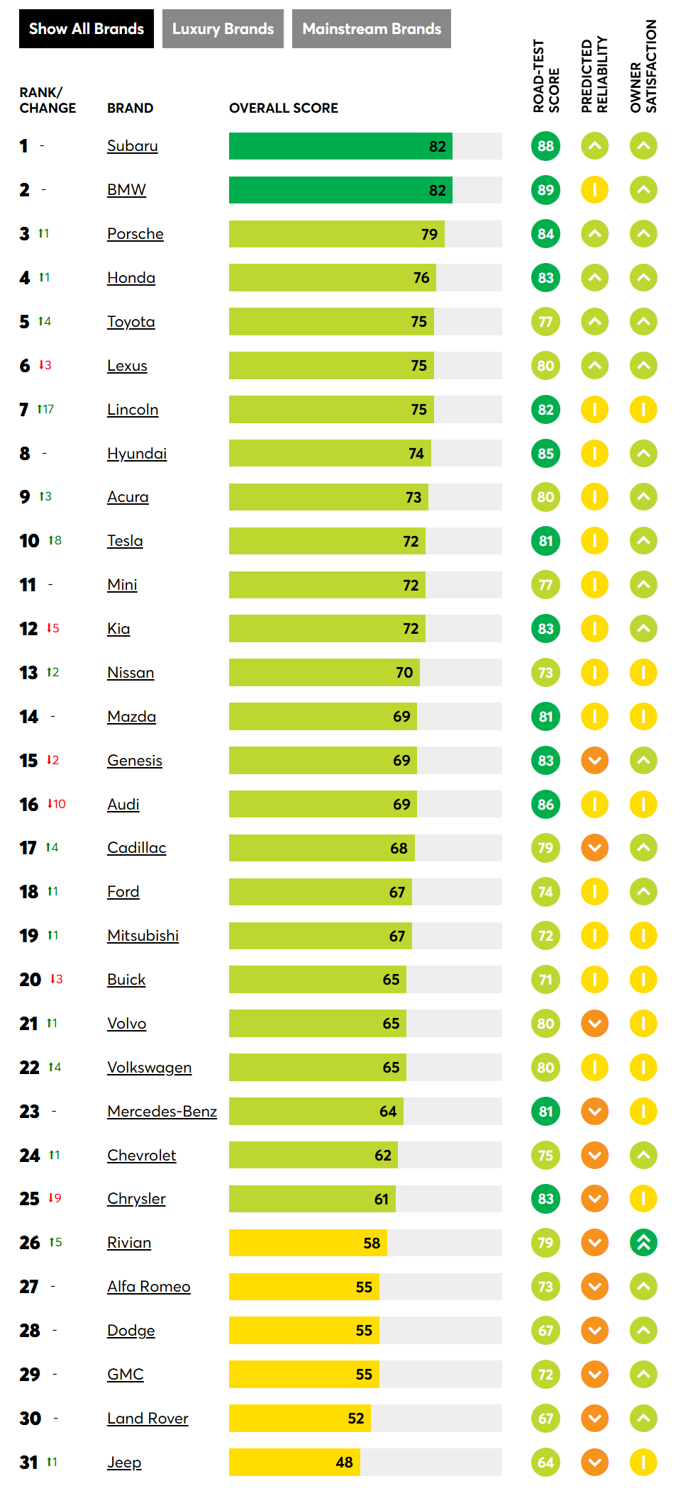 此外,《消费者报告》还指出,我们只在测试了该车企至少两款在售车型的情况下,才将其纳入品牌排名。因此,榜单中没有出现菲亚特、英菲尼迪、捷豹、Lucid、玛莎拉蒂、Polestar或Ram的评分。
