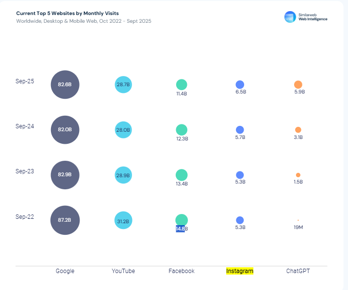 在这波浪潮中,ChatGPT 依然牢牢占据着流量中心位置。 OpenAI 的这款聊天机器人网站,从 2022 年每月约 1900 万次访问,跃升到 2025 年 9 月约 59 亿次访问,在全球网站排名中已经挤进前五,与同月获得约 65 亿次访问量的 Instagram 并驾齐驱。