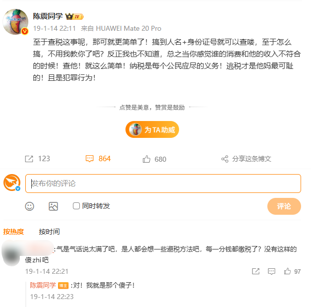 据了解,陈震曾在2019年发文称:纳税是每个公民应尽的义务!逃税才是最可耻的!且是犯罪行为!