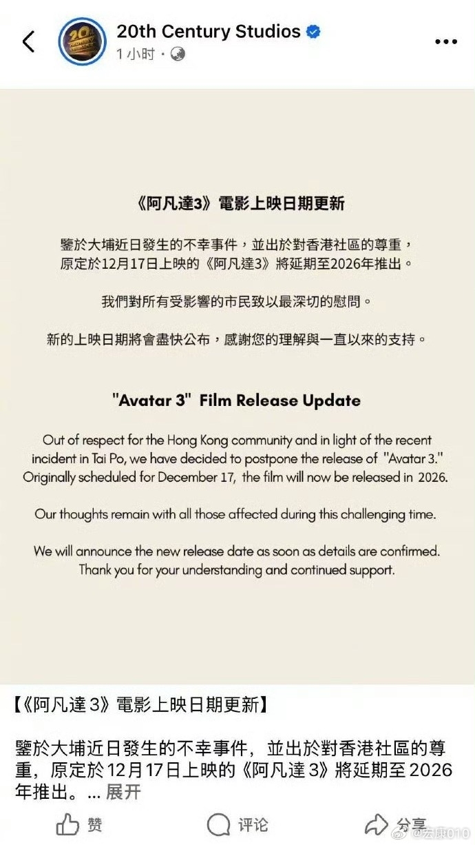 二十世纪影业官方宣布,电影《阿凡达3》在中国香港撤档,延期至2026年上映。官方在公告中称,鉴于大埔近日发生的不幸事件,并出于对香港社区的尊重,原定于12月17日上映的《阿凡达3》将延期至2026年推出。新的上映日期将会尽快公布。