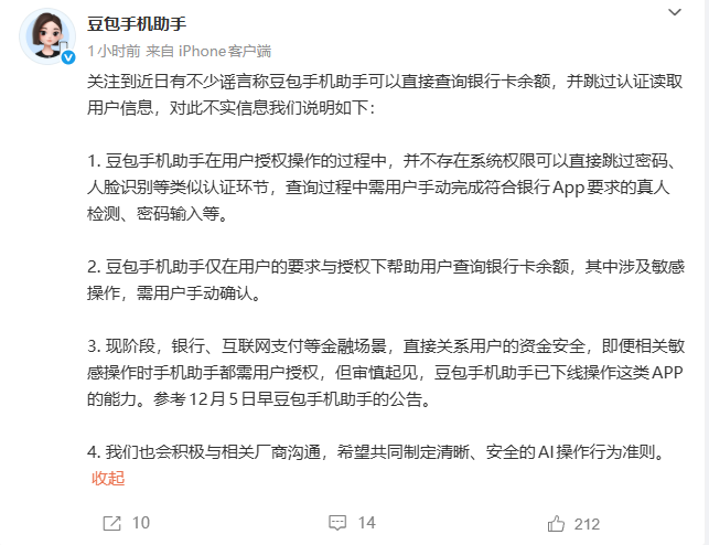 关注到近日有不少谣言称豆包手机助手可以直接查询银行卡余额,并跳过认证读取用户信息,对此不实信息我们说明如下: