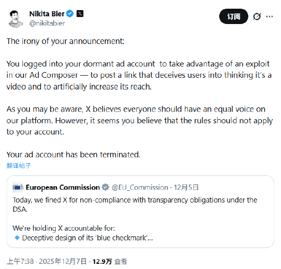 X产品负责人尼基塔・比尔转发欧盟委员会于5日发布的对X公司罚款声明,并表示:“你的声明颇具讽刺意味:你登录长期未使用的广告账户,利用我们广告编辑器的漏洞发布链接 —— 该链接误导用户以为是视频,且人为提升其曝光量。”