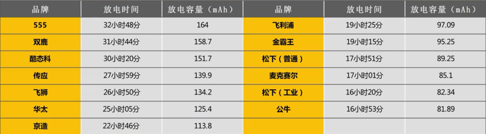 最终555以32小时48分的放电时间、放电容量164毫安时位居第一,价格最贵的松下车钥匙专用款放电容量仅有82.34毫安时,居倒数第二,公牛则以81.89毫安时放电容量垫底。