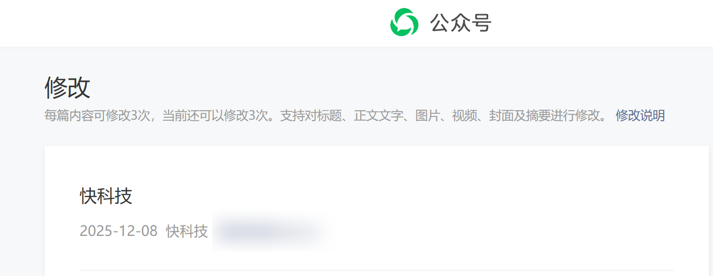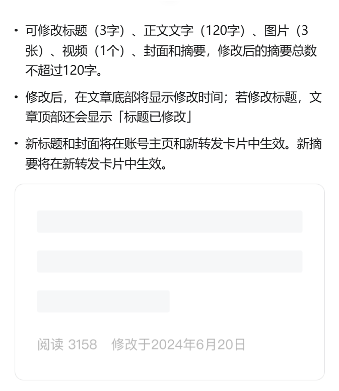 具体规则方面,每次修改可修改标题(3字)、正文文字(120字)、图片(3张)、视频(1个)、封面和摘要,修改后的摘要总数不超过120字。