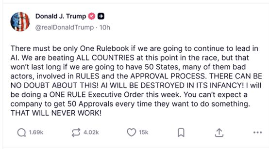 特朗普预告:本周将签行政令 为AI制定统一国家规则
