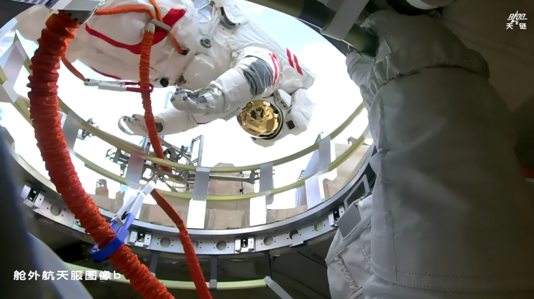 在空间站机械臂和地面科研人员的配合支持下,出舱的张陆、武飞完成了神舟二十号飞船返回舱舷窗巡检拍照、空间站空间碎片防护装置安装、温控适配器多层罩更换等任务,已安全返回问天实验舱。