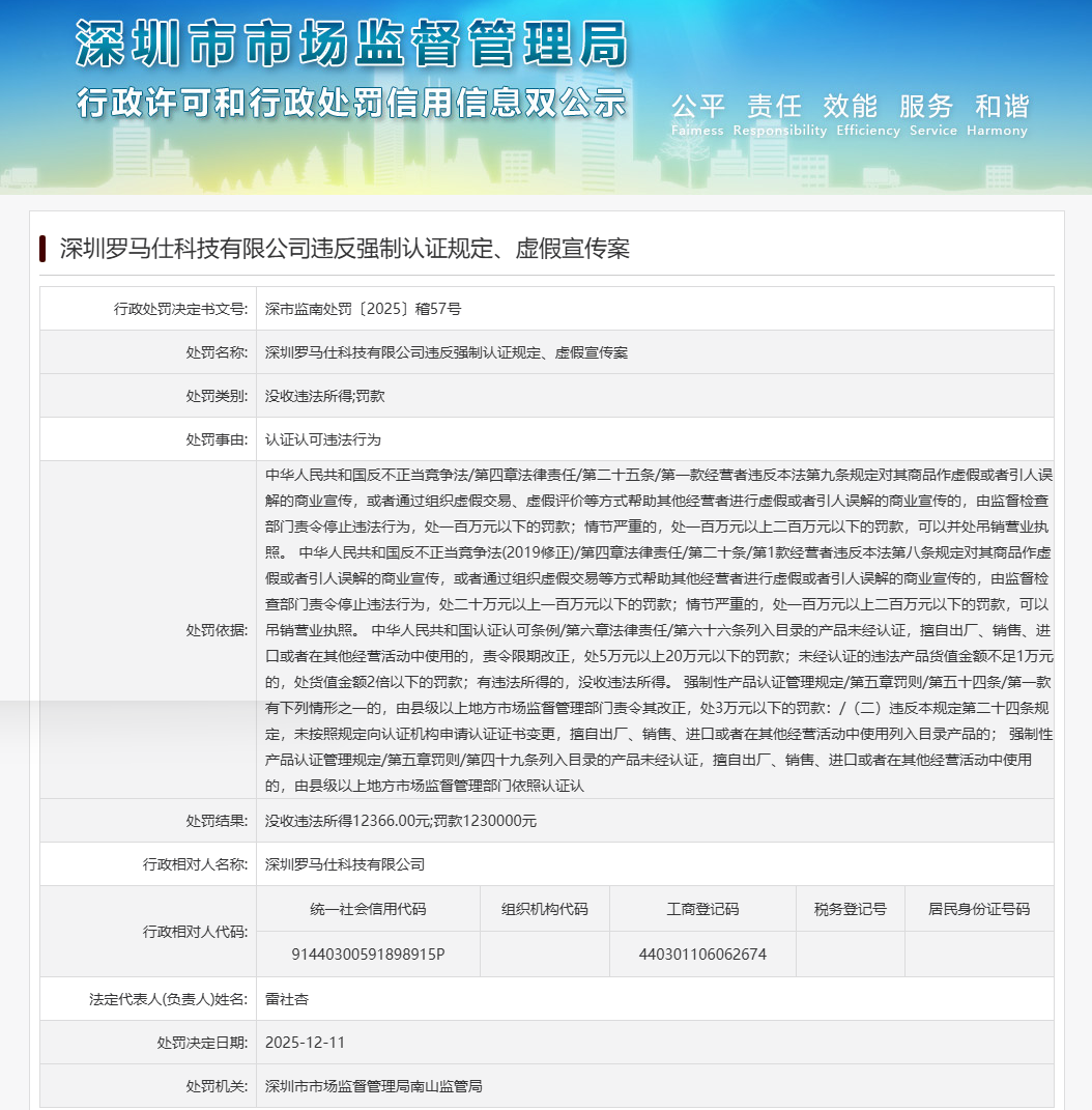 根据深圳市市场监督管理局网站显示,近日,深圳罗马仕科技有限公司因违反强制认证规定、虚假宣传案,被深圳市市场监督管理局南山监管局没收违法所得1.2万余元、罚款123万元,处罚事由为认证认可违法行为。