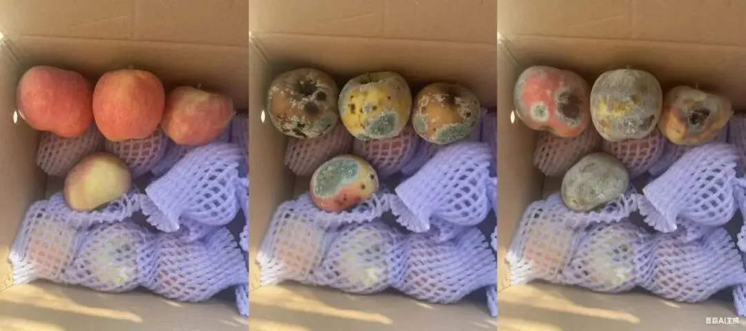 我们让千问、豆包帮忙将一张正常的苹果照片,P成“发霉发烂”的样子,整个过程只需要20秒不到,但效果稍微差了一些。有网友表示,诸如蓝莓、香蕉等造假效果会更真实,这跟拍摄角度、光线等也有关系。