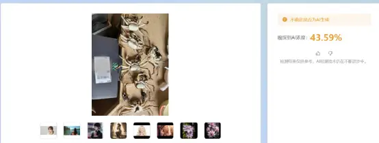 我们将她收到的螃蟹照片放到了千问、豆包等大模型中辨别真假,大模型给出的答案有真也有假。我们将图片放到了专业检测AI浓度的软件里,得出的结论也是“难以确定是否AI生成”。