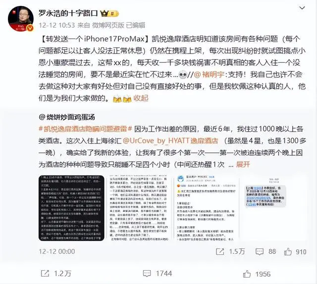 这事儿被罗永浩看到后,直接转发开怼:“凯悦逸扉酒店明知道房间有各种问题,每个问题都足以让客人没法正常休息,却仍然在携程上架,每次出现纠纷时就试图搞点小恩小惠蒙混过去。每天收一千多块钱祸害不明真相的客人,要不是最近实在忙不过来……”