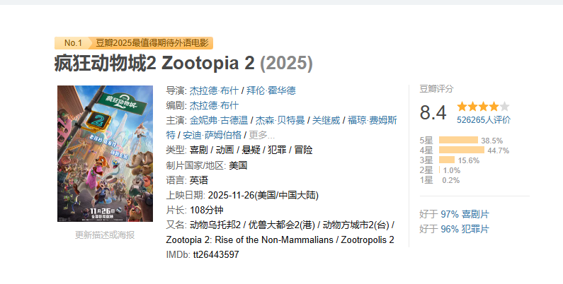 迪士尼动画电影《疯狂动物城2》票房破35亿 豆瓣评分降至8.4