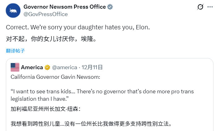 在当地时间12月11日,美国加利福尼亚州州长纽森在一则视频中表示,他希望看到跨性别儿童,且没有哪位州长比他制定了更多支持跨性别者的立法。次日,纽森办公室转发该视频,并配文嘲讽:“没错,很遗憾你女儿恨你,埃隆。”