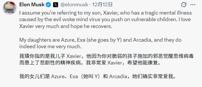 马斯克随即在下方留言驳斥,称“我猜你指的是我的儿子泽维尔(Xavier),他患上了悲惨的精神疾病,这都是你向脆弱的儿童们灌输邪恶‘觉醒思想病毒’所致。”