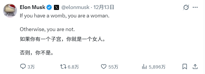 在13日发布并置顶的帖文中,他表示:“如果你有子宫,你就是女人;否则,你就不是女人。”