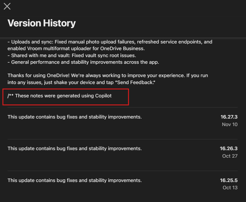 近日Windows Latest发现,微软在OneDrive iOS版本的更新日志底部,添加了一行声明:“本说明由Copilot生成。”不过苹果App Store的指南并未要求开发者披露如何撰写更新说明,微软的这一举动显然是刻意为之,这也被视为微软一种巧妙且低风险推广Copilot的策略。