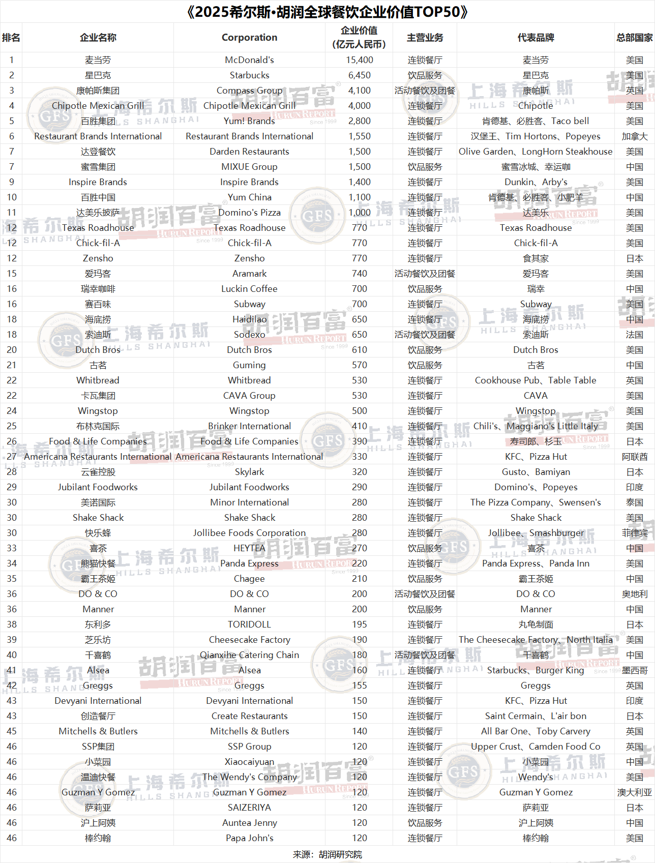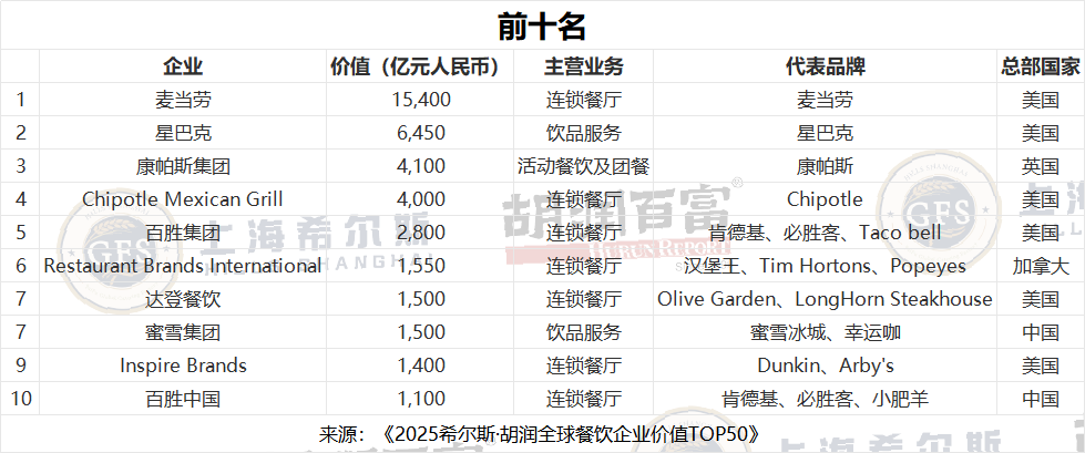 胡润研究院发布了《2025希尔斯·胡润全球餐饮企业价值TOP50》,按照企业市值或估值进行排名。这是胡润研究院第4次发布餐饮行业榜单,也是首次发布全球范围的餐饮企业价值榜单。