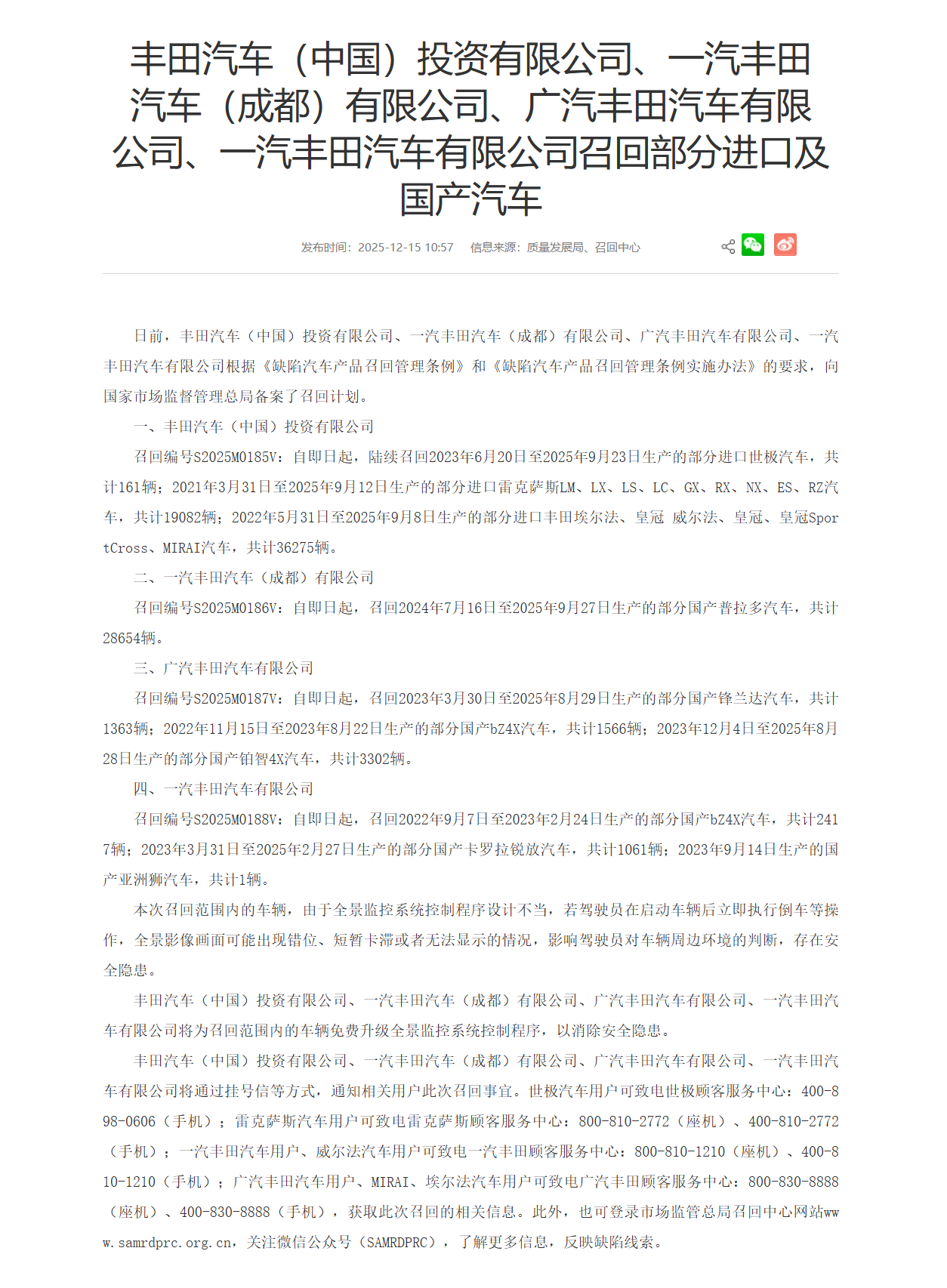 国家市场监督管理总局今日发布召回公告,丰田多款车型进行召回。以下为召回详细公告: