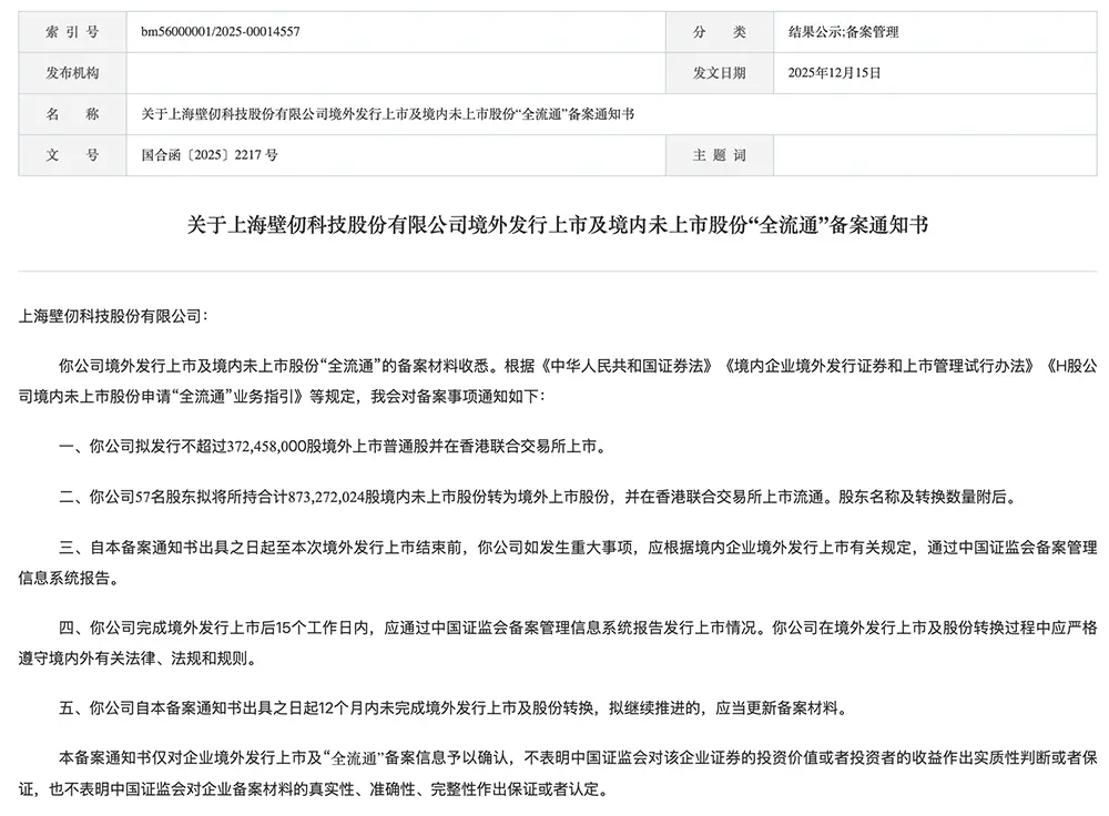 根据备案通知书,壁仞科技57名股东拟将所持合计873,272,024股境内未上市股份转为境外上市股份,并在香港联合交易所上市流通。