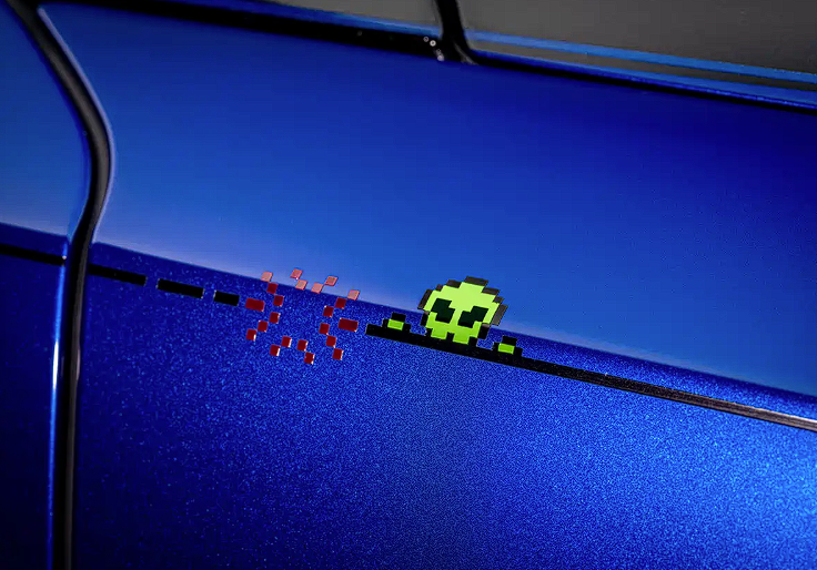 车身侧面的手绘腰线上,有89个3毫米见方的像素块构成的“俏皮外星人”图案,旁边还点缀着小巧的8位像素爆炸图案,致敬早期街机游戏中的经典外星角色。