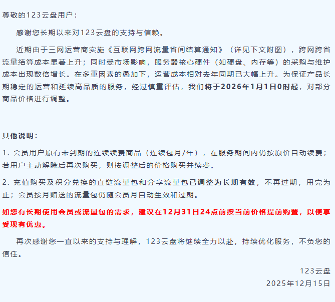 日前,123云盘发布通知称,受网络运营商及市场影响,平台部分商品将进行价格调整,新价格将于2026年1月1日0时起正式生效。123云盘表示,近期由于三网运营商实施《互联网跨网流量省间结算通知》,导致跨网跨省流量结算成本显著上升。