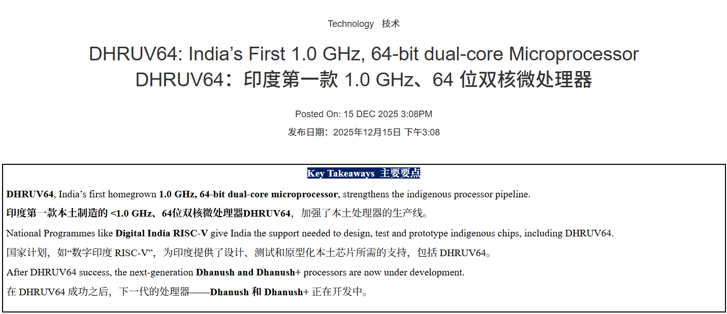 其还表示,目前印度消耗了全球约20%的微处理器,DHRUV64的成功为其提供了一个现代化的本土处理平台。