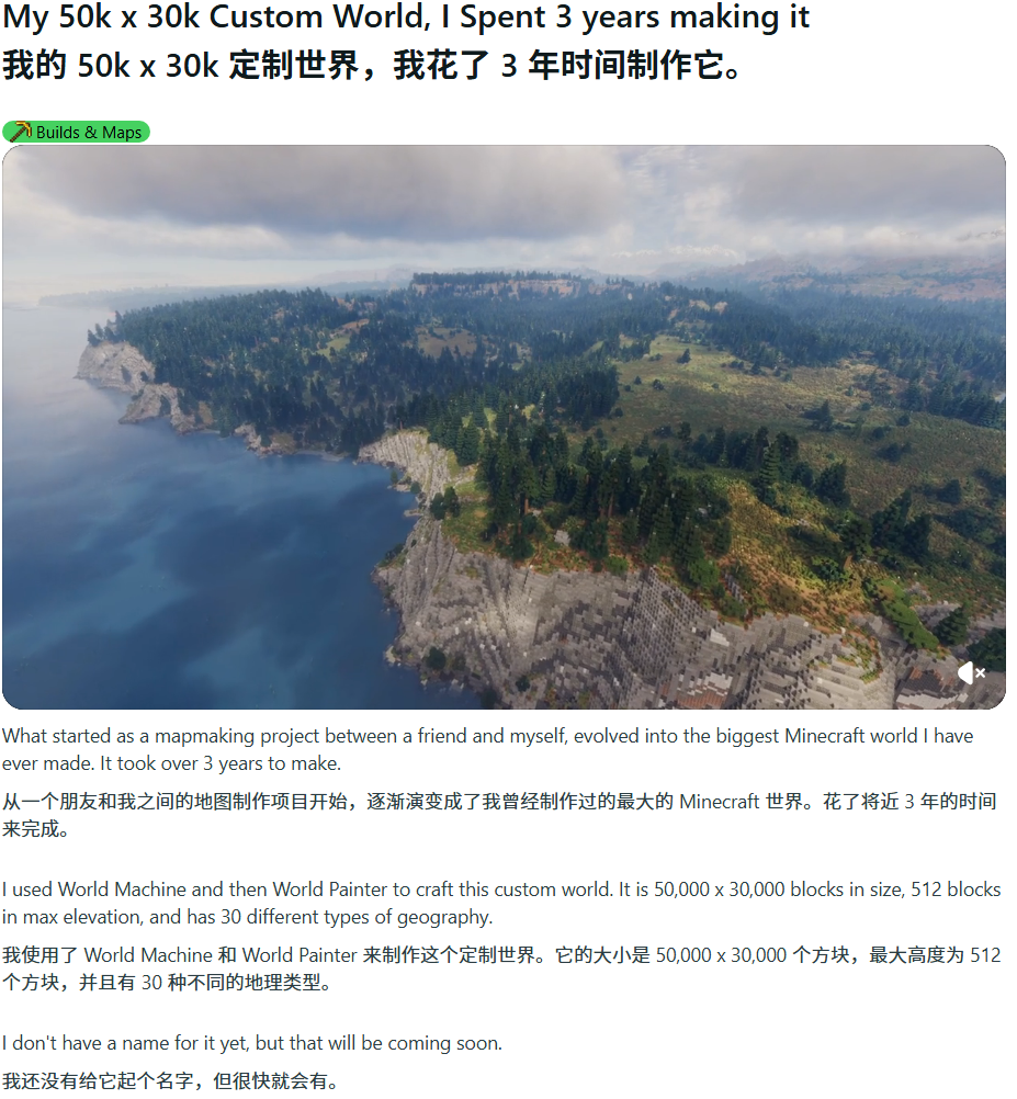 《我的世界》玩家的想象力似乎永远没有上限,近日,Reddit 用户 Plopidr_ 展示了一个声称花了三年时间制作的世界。这个历时三年打造的巨型世界,其逼真程度已经超越了许多人的认知,仿佛是在游戏中重现了现实的自然景观。