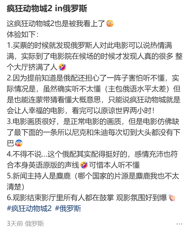 在内容上还有本土化调整,比如把原版熊猫主播换成了驯鹿,搭配的俄语配音不仅口型严丝合缝,还精准还原了朱迪的热血、尼克的狡黠等角色特质,连树懒闪电的慵懒语速都复刻到位,部分观众甚至觉得观影体验不输正版。