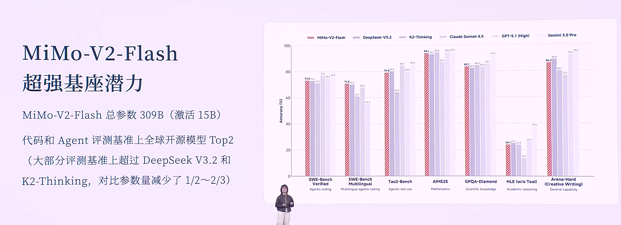 罗福莉进一步表示,小米MiMo-V2-Flash蕴含着超强基座潜力。尽管其总参数仅为309B(激活15B),但在代码和Agent评测基准上,它已跻身全球开源模型Top2行列,在大部分评测基准上甚至超越了DeepSeek V3.2和K2-Thinking,而参数量却减少了1/2至2/3,真正实现了以小博大。