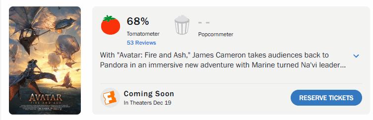 《阿凡达3》口碑已开!烂番茄新鲜度68%,均分6.4!不及第一部《阿凡达》81%新鲜度、7.8均分以及《阿凡达2》76%新鲜度、7.1均分。MetaCritic开分64,不及第一部的83及前作《阿凡达2》的67分。口碑优缺点都非常明显,放低期待,或许还能有惊喜。