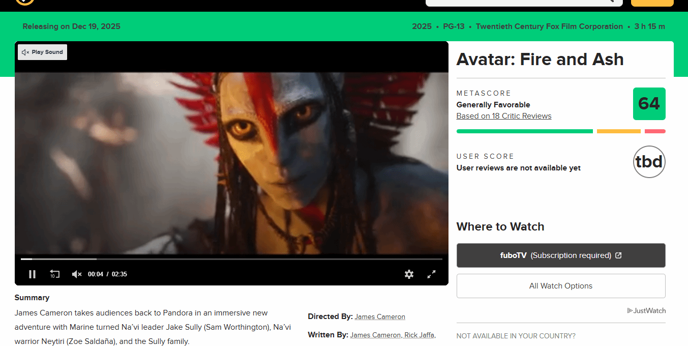 《阿凡达3》媒体口碑解禁 M站64分 降低期待