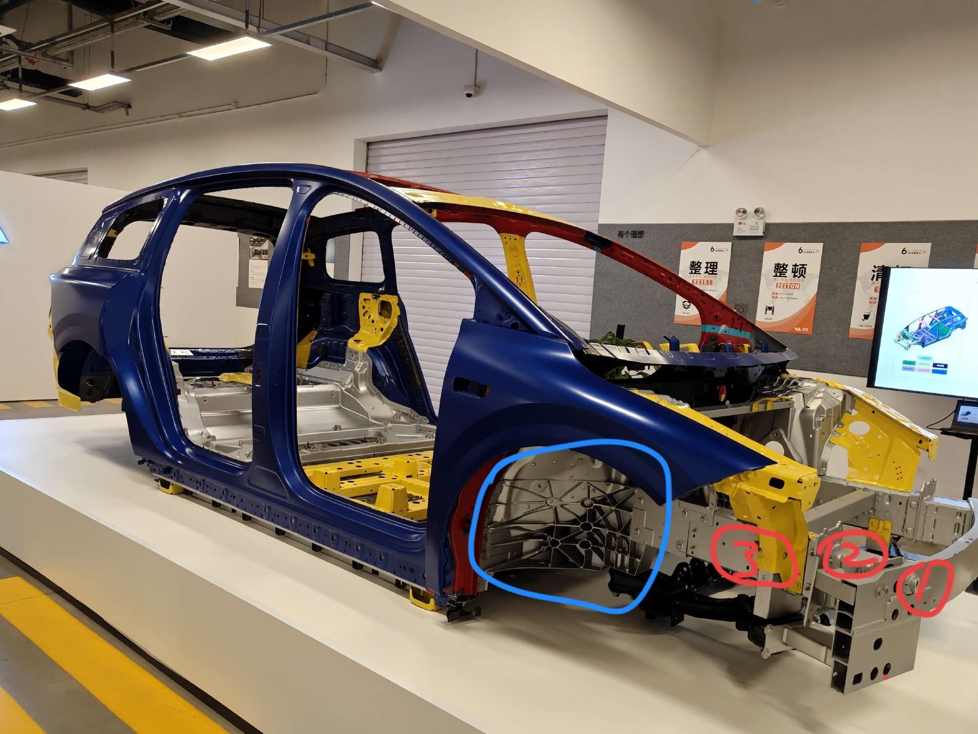 以理想i8的一体化压铸车体为例,图1,图2是理想i8的后部和前部车体,蓝色的圈是一体压铸结构,红色标记的1.2.3的那个是铝合金防撞梁、铝合金吸能盒、铝合金纵梁。