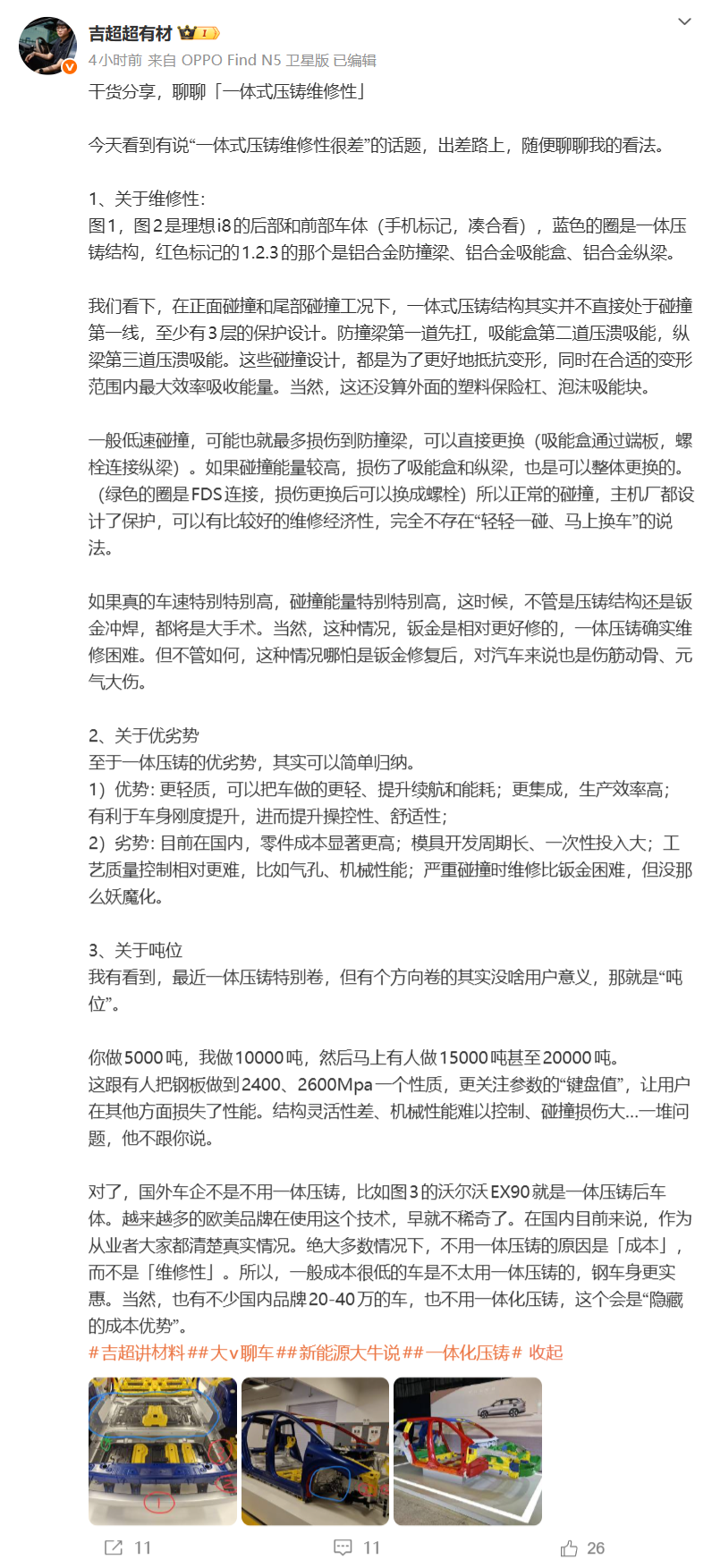 在昨日的欧拉5上市发布会上,长城汽车董事长魏建军称,汽车的一体化压铸车身在中国成本不低,维修性也特别差,此番言论引发网友热议。对此,理想汽车材料技术负责人“@ 吉超超有材”发表了自己的看法。
