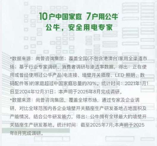 值得注意的是,对于这句宣传语,公牛也在官网有明确标注,数据来源于尚普咨询集团:2021年1月1日至2024年12月31日,使用或曾经使用过公牛产品(电连接、墙壁开关插座、LED 照明、数码配件等)的家庭超过中国家庭总量的70%。