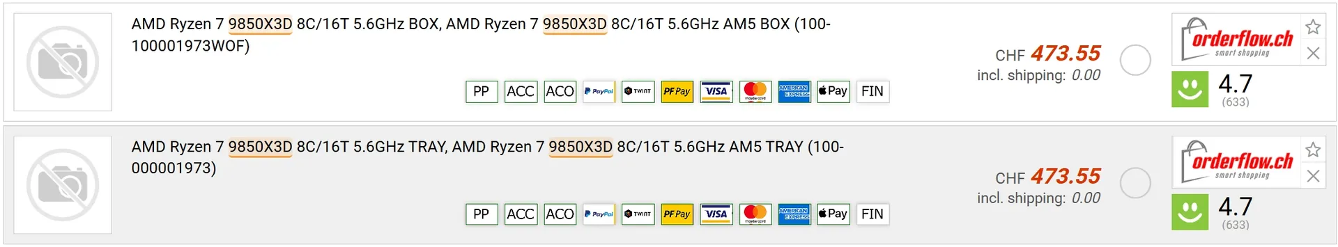 美国零售商SHI已经将锐龙7 9850X3D上架,标价为553.09美元(约人民币3895元),与此同时,瑞士一家零售商也曾开出473.55瑞郎(约人民币4192元)的价格。