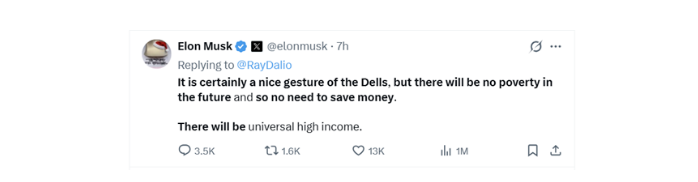 埃隆·马斯克在回复桥水基金创始人雷·达里奥的发言时再次阐述其观点:在人工智能与机器人技术推动下,未来社会或将进入“全民高收入”阶段,届时储蓄将不再具有必要性。