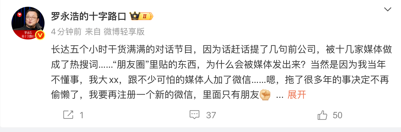 朋友圈内容被当新闻发 罗永浩:将注册新微信,只加朋友