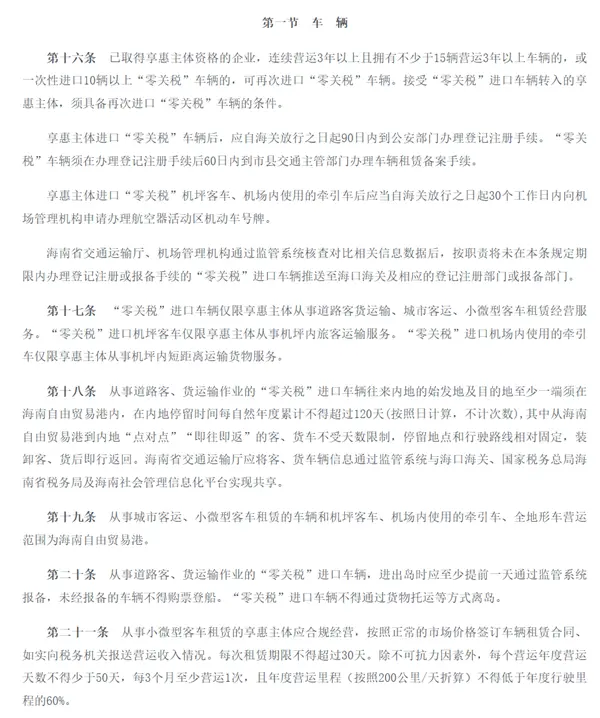 同时,车辆必须确保始发地及目的地至少一端在海南自由贸易港内,且每年在中国内地停留时间累计不超过120天(按日计算,不计次数)。而且即便是企业购买,还得满足条件:公司要么有15辆以上营运满3年的车,要么一次性进口不少于15辆零关税车。