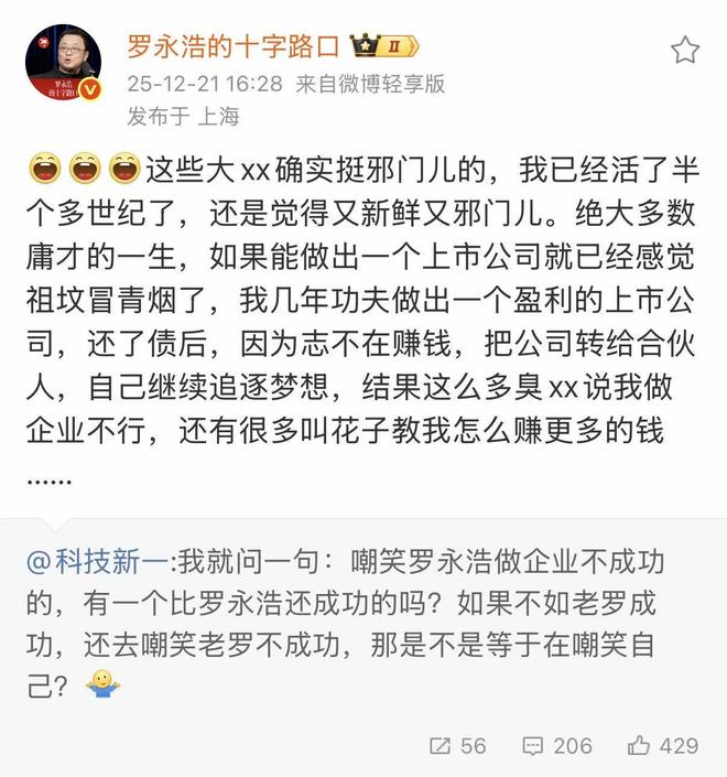 罗永浩还回击了项立刚对他“除了直播什么都干不成”的评价: