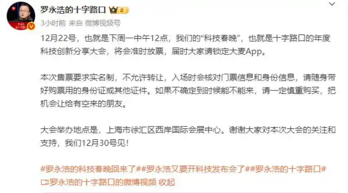 此前在12月19日,该账号就曾预告,12月22日中午12点,“科技春晚”——十字路口的年度科技创新分享大会将准时放票,且本次售票实行严格的实名制,门票不允许转让,入场时需严格核对门票信息与身份信息。