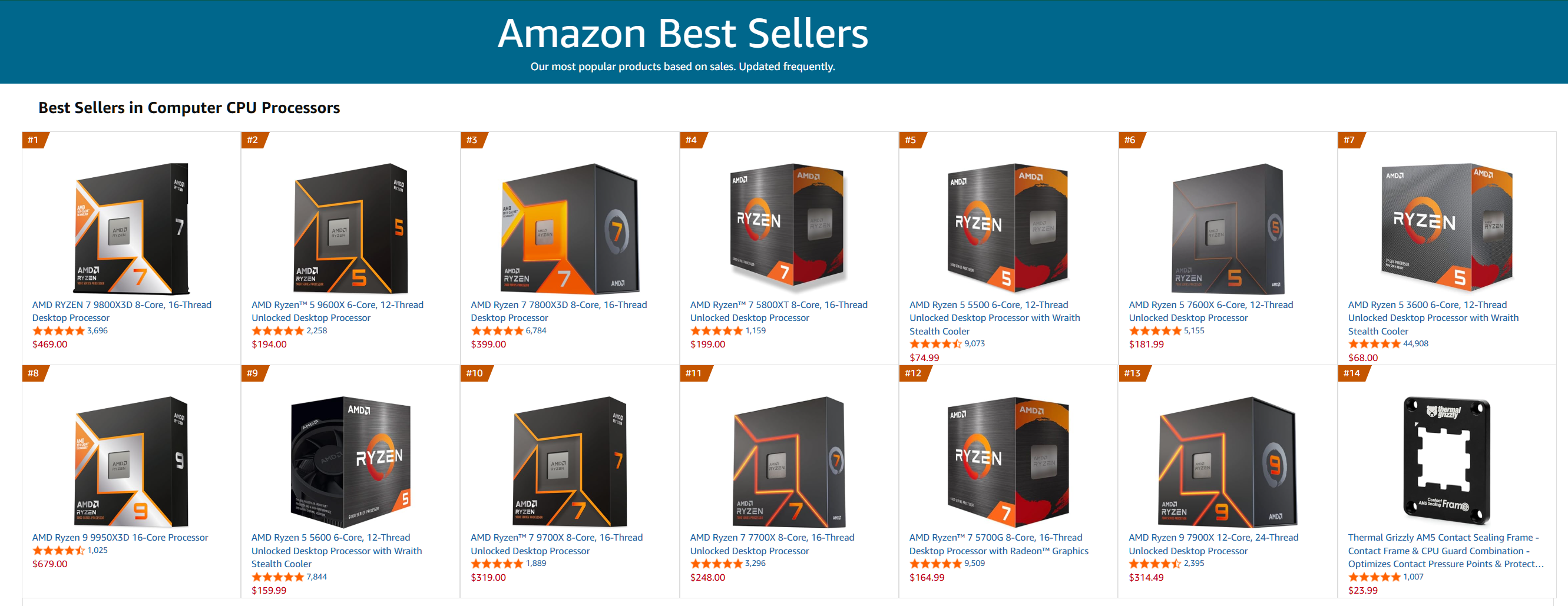 AMD在亚马逊平台上的处理器销量优势正在进一步扩大,最新数据显示,其产品已经包揽亚马逊当前最畅销CPU前14名,并在前20名中拿下19个席位,仅留出一个位置给Intel。这延续了2024年11月以来AMD在零售市场的强势表现,当时其同样在亚马逊热销榜上占据前12名。